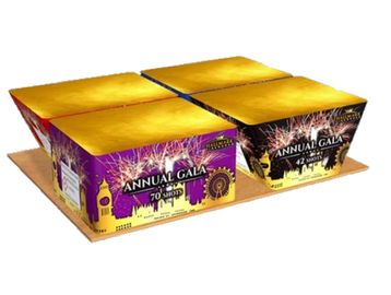 Annual gala by Hallmark is a 224 shot compound firework, it has 2 straight and 2 fanned fireworks all pre fused together for a display lasting over 2 minutes. Absolutely stunning.
