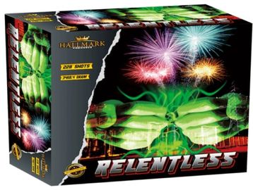 Relentless by Hallmark Fireworks contains 3468g of NEC firing 228 shots from 25mm bore tubes and lasts approx. 2 minutes and 18 seconds. Firing in a multitude of patterns and a variety of colours, this firework is loud and will definitely be the centre piece of and display.
