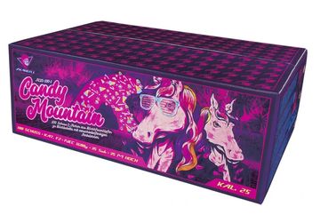Candy Mountain Barrage from Funke. Funke produce fireworks that wouldn't look out of place at a professional display and this 100 shot barrage is no exception. Enormous bursts fill the sky in a fast firing fanned motion that produce an effect normally only seen at professional displays. Beautiful coloured rising tail effect that then burst into a variety of colours and effects.