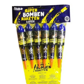 Superbomben by Funke is a pack of 6 rockets with each containing a massive 100g of powder and each rocket having a different effect.